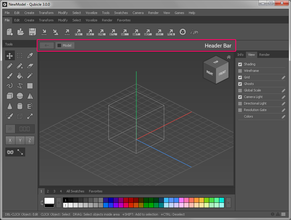 The Header Bar helps you to navigate the object hierarchy of your model.